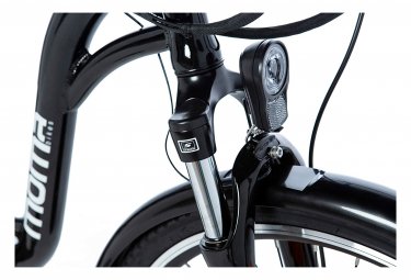 Il est équipé d’un cadre en aluminium, de 7 vitesses , de composants Shimano, de roues de 26 pouces, d’une suspension avant hydraulique Zoom et de freins à disque avant et arrière. Il dispose aussi de tous les accessoires nécessaires comme : éclairage LED avant et arrière, porte bagage arrière, garde-boue, protège – chaîne, béquille et sonnette.