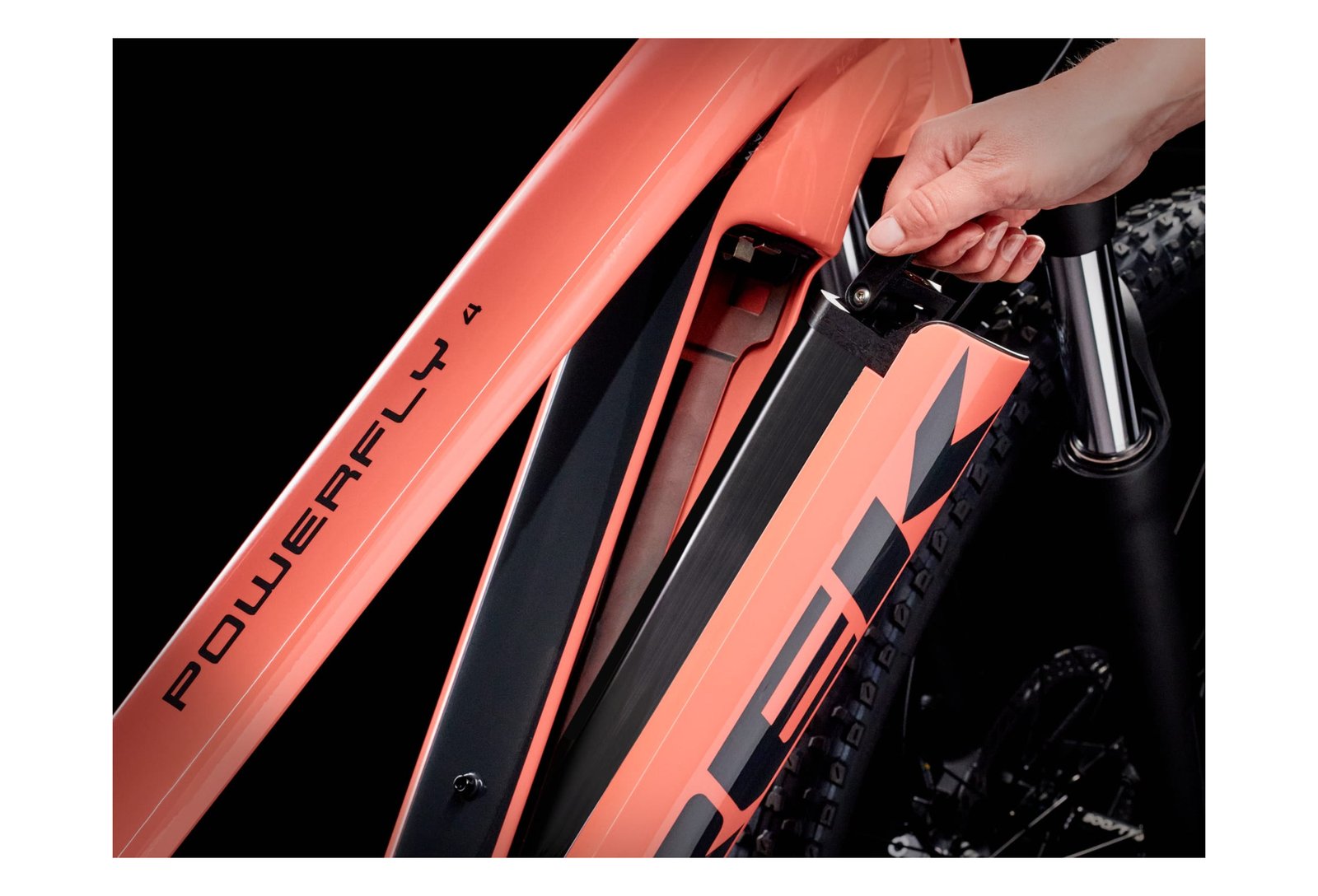 - Le système de batterie intégrée amovible de Trek affiche un look remarquable et est on ne peut plus convivial : il dissimule complètement la batterie dans le cadre afin de la protéger, il permet de retirer aisément la batterie sans outillage et laisse de l’espace pour la fixation d’un porte-bidon.